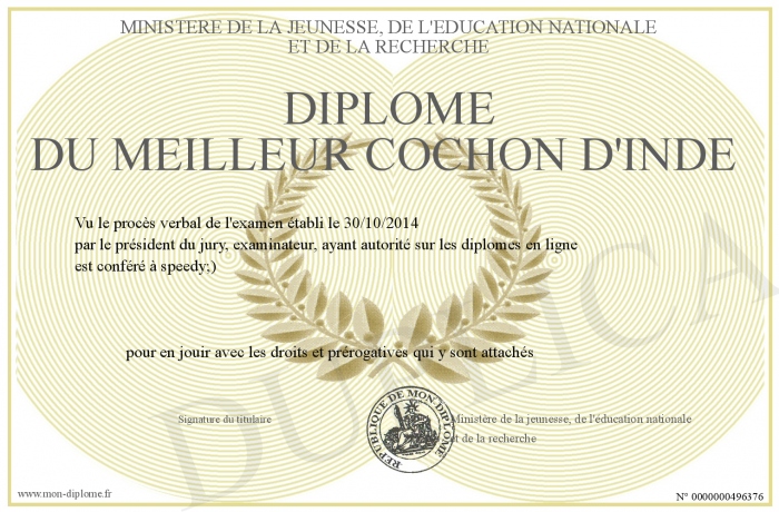 Envoyez par email votre Diplôme du meilleur cochon d'Inde personalisé