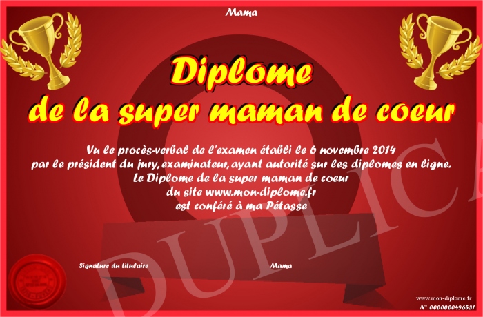 Envoyez par email votre Diplôme de la super maman de coeur personalisé
