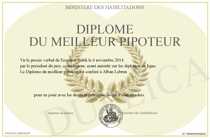 Envoyez par email votre Diplome du meilleur pipoteur personalisé
