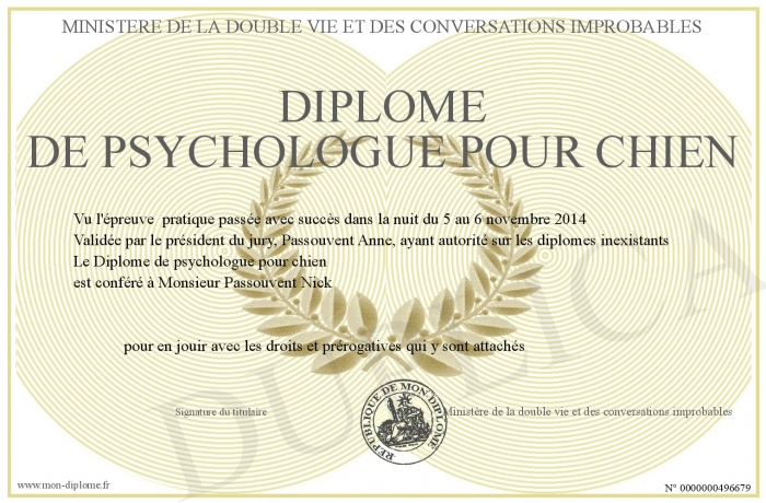 Envoyez par email votre Diplôme de psychologue pour chien personalisé