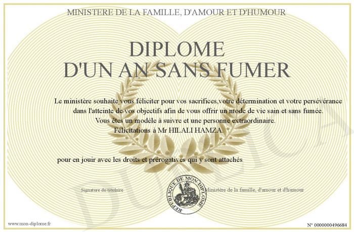 Envoyez par email votre Diplôme d'un an sans fumer personalisé