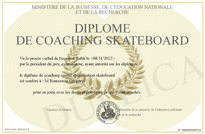 Envoyez par email votre Diplôme de Coaching Skateboard personalisé