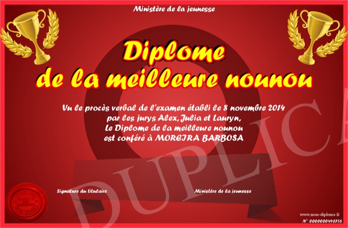 Envoyez par email votre Diplôme de la meilleure nounou personalisé