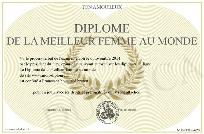 Envoyez par email votre Diplôme de la meilleur femme au monde personalisé