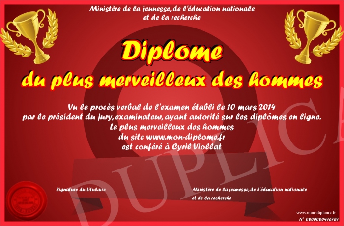 Envoyez par email votre Diplôme du plus merveilleux des hommes personalisé