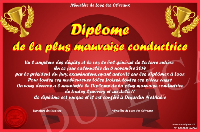 Envoyez par email votre Diplôme de la plus mauvaise conductrice personalisé