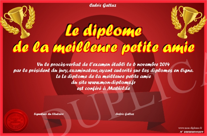 Envoyez par email votre Le diplôme de la meilleure petite amie personalisé