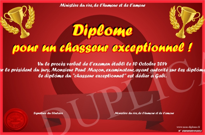 Envoyez par email votre Diplôme pour un chasseur exceptionnel ! personalisé