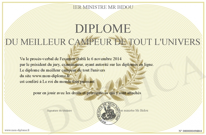 Envoyez par email votre diplôme du meilleur campeur de tout l'univers personalisé