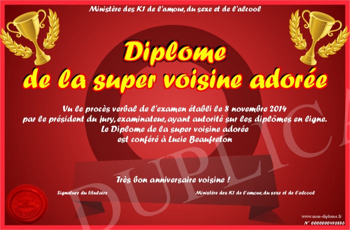 Envoyez par email votre Diplôme de la super voisine adorée personalisé