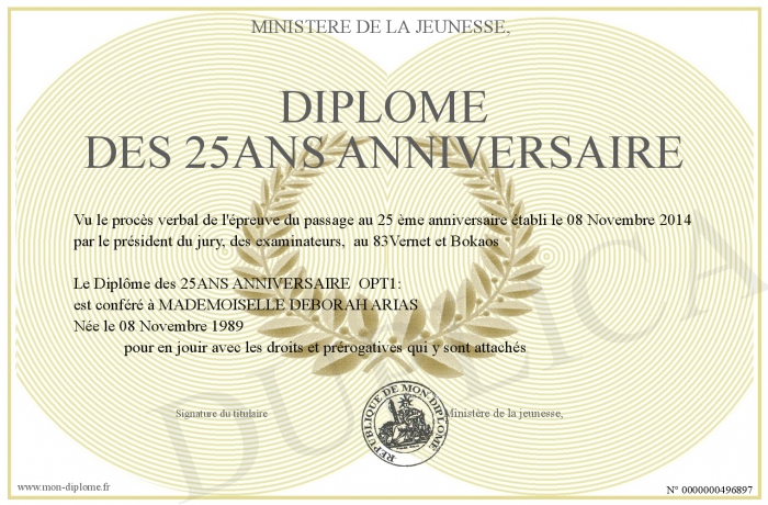 Envoyez par email votre Diplôme des 25ANS Anniversaire personalisé