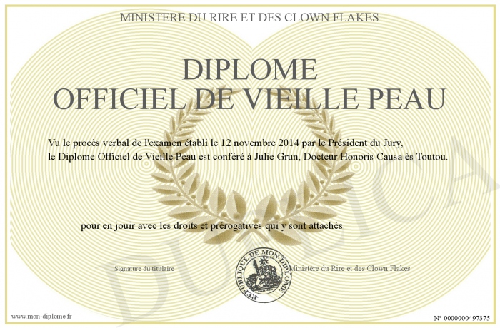 Envoyez par email votre Diplôme Officiel de Vieille Peau personalisé