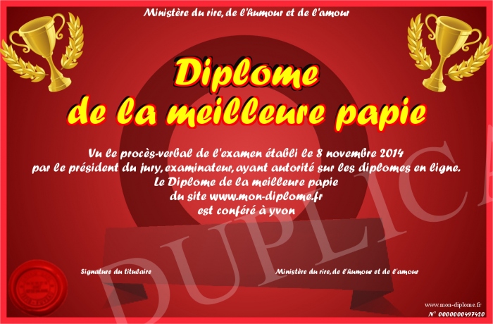 Envoyez par email votre Diplome de la meilleure papie personalisé