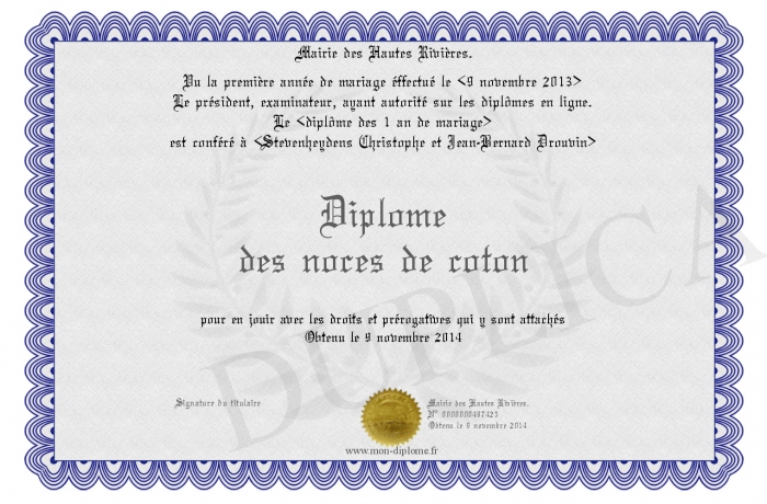 Envoyez par email votre Diplôme des noces de coton personalisé
