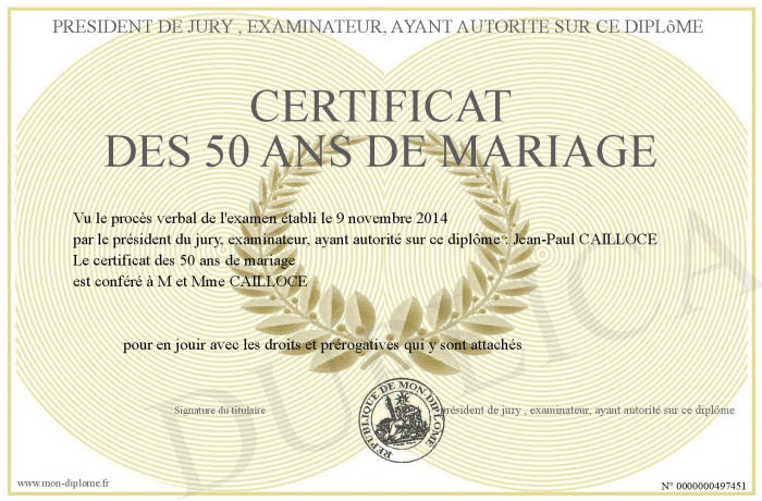 Envoyez par email votre certificat des 50 ans de mariage personalisé