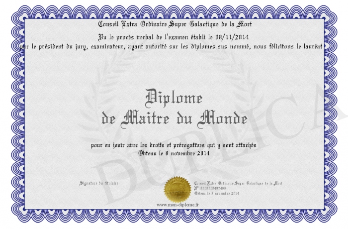 Envoyez par email votre Diplôme de Maitre du Monde personalisé