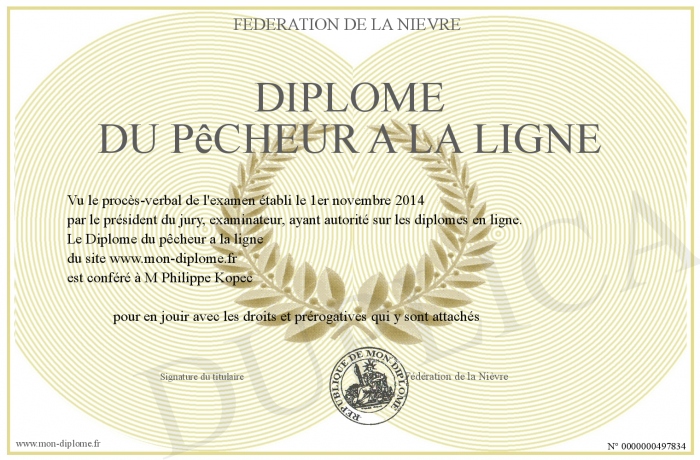 Envoyez par email votre Diplôme du pêcheur a la ligne personalisé