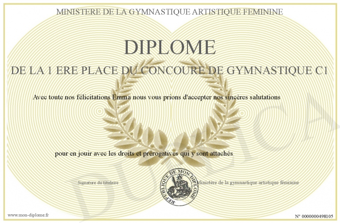 Envoyez par email votre Diplôme de la 1 ère place du concoure de gymnastique C1 personalisé
