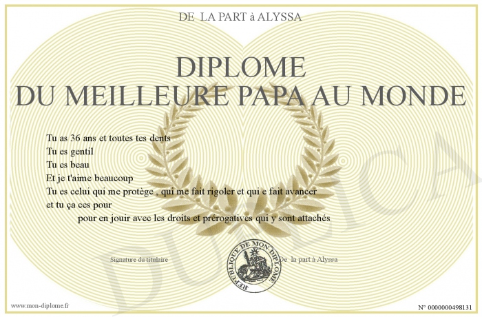 Envoyez par email votre Diplome du meilleure papa au monde personalisé