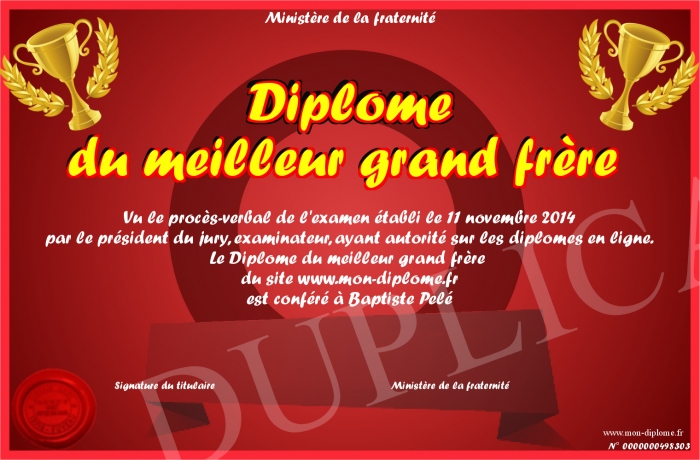 Envoyez par email votre Diplome du meilleur grand frère personalisé