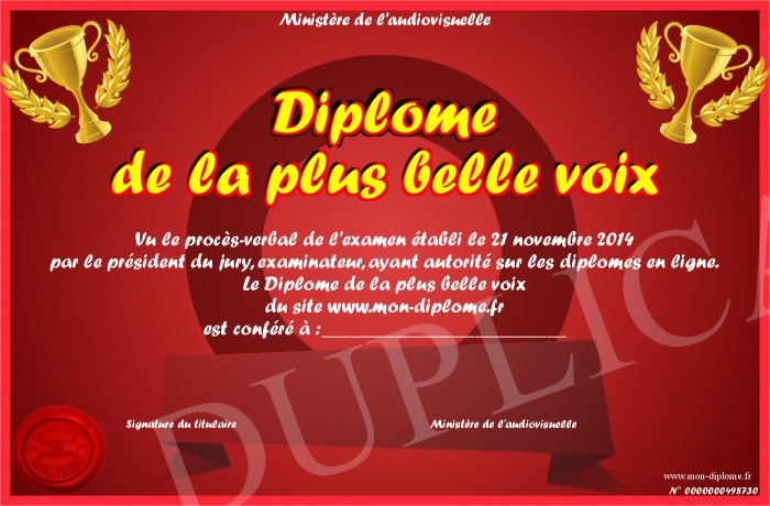 Envoyez par email votre Diplôme de la plus belle voix personalisé