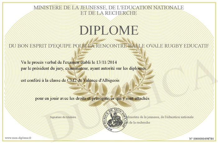 Envoyez par email votre Diplôme du bon esprit d'équipe pour la rencontre balle ovale rugby éducatif personalisé