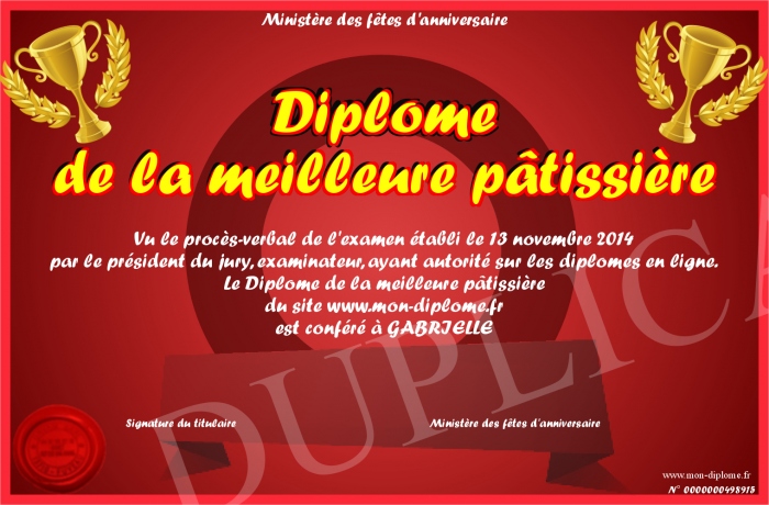 Envoyez par email votre Diplôme de la meilleure pâtissière personalisé