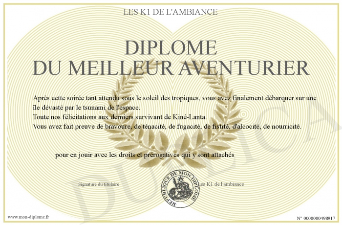 Envoyez par email votre Diplôme du meilleur aventurier personalisé