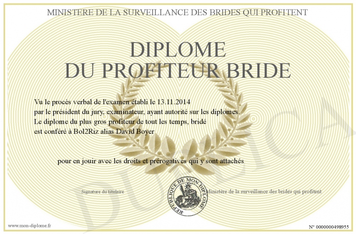 Envoyez par email votre Diplôme du profiteur BRIDE personalisé