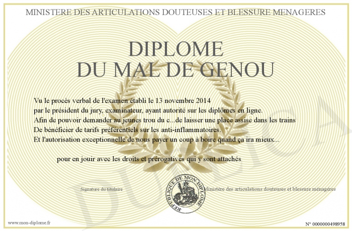 Envoyez par email votre Diplôme du mal de Genou personalisé