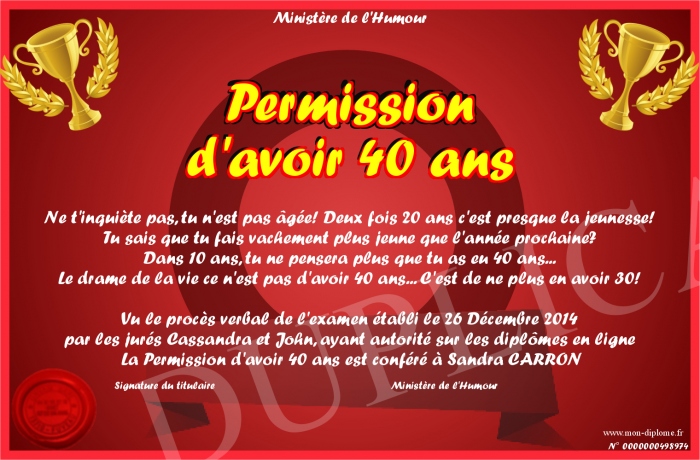 Envoyez par email votre Permission d'avoir 40 ans personalisé