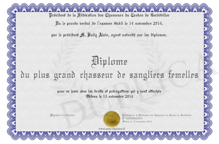 Envoyez par email votre Diplôme du plus grand chasseur de sangliers femelles personalisé