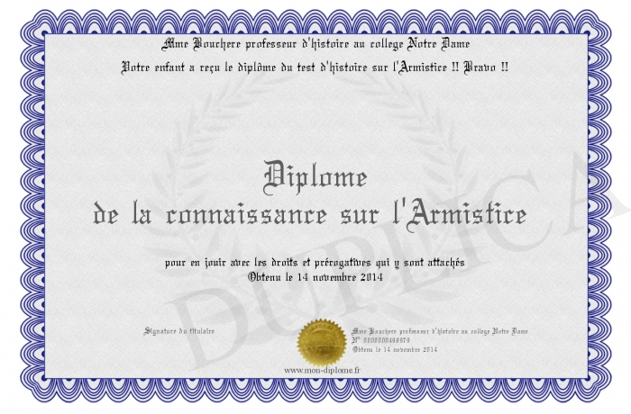Envoyez par email votre Diplôme de la connaissance sur l'Armistice personalisé