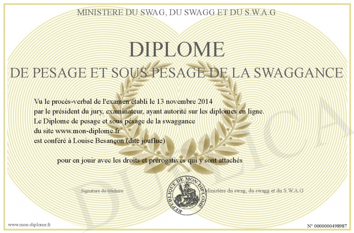 Envoyez par email votre Diplôme de pesage et sous pésage de la swaggance personalisé