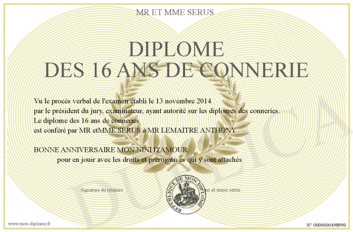 Envoyez par email votre Diplôme des 16 ans de connerie personalisé