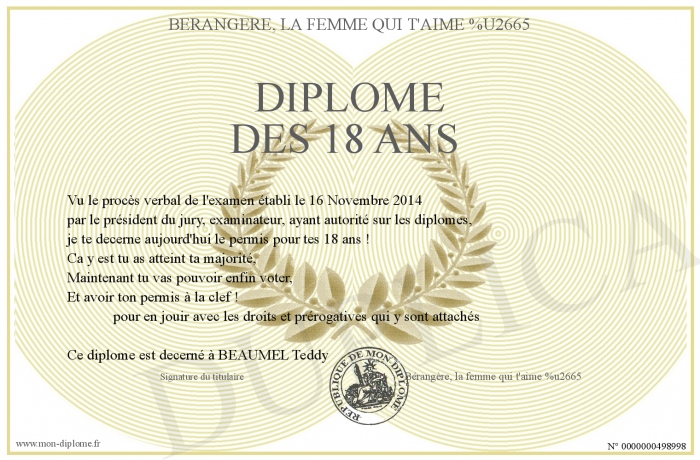 Envoyez par email votre Diplôme des 18 ans personalisé