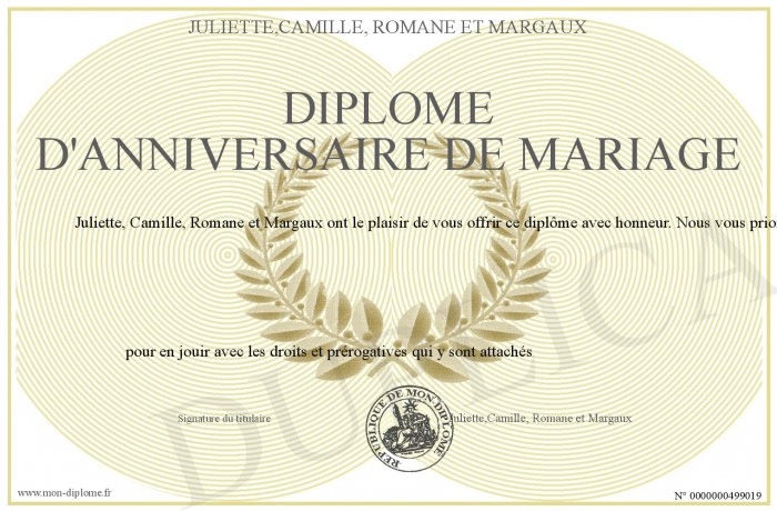 Envoyez par email votre Diplôme d'anniversaire de mariage personalisé