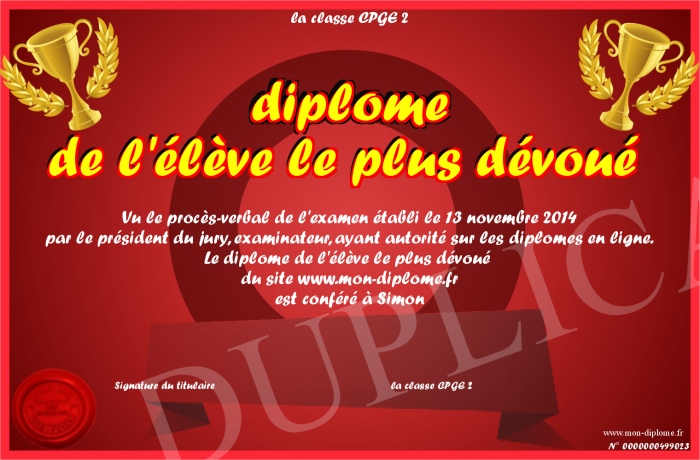 Envoyez par email votre diplôme de l'élève le plus dévoué personalisé