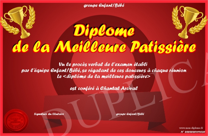 Envoyez par email votre Diplôme de la Meilleure Patissière personalisé