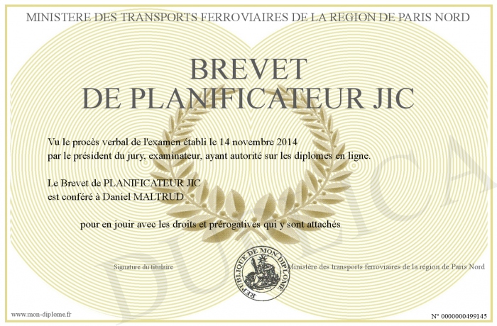 Envoyez par email votre Brevet de PLANIFICATEUR JIC personalisé