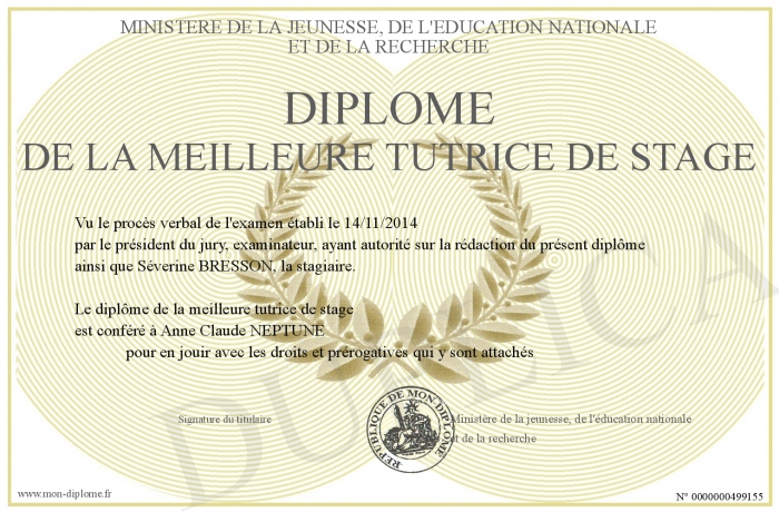 Envoyez par email votre Diplôme de la meilleure tutrice de stage personalisé