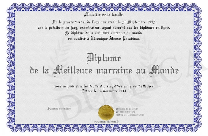 Envoyez par email votre Diplôme de la Meilleure marraine au Monde personalisé