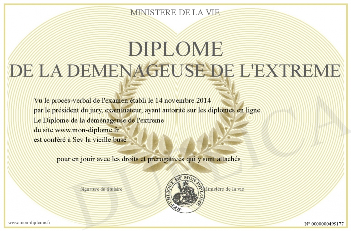 Envoyez par email votre Diplôme de la déménageuse de l'extreme personalisé