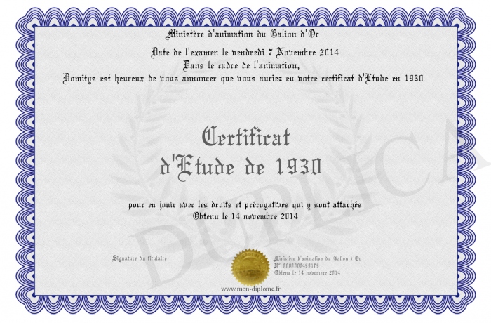 Envoyez par email votre Certificat d'Etude de 1930 personalisé