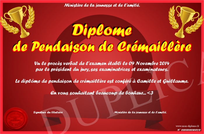 Envoyez par email votre Diplôme de Pendaison de Crémaillère personalisé
