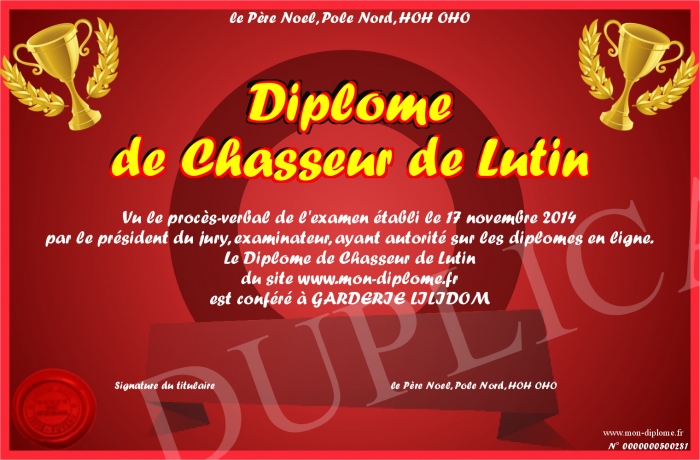 Envoyez par email votre Diplôme de Chasseur de Lutin personalisé