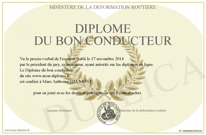 Envoyez par email votre Diplôme du bon conducteur personalisé