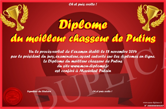 Envoyez par email votre Diplôme du meilleur chasseur de Putins personalisé
