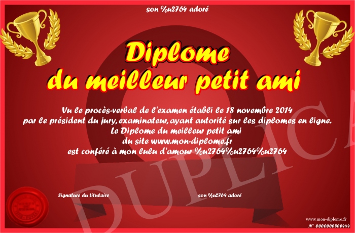 Envoyez par email votre Diplôme du meilleur petit ami personalisé