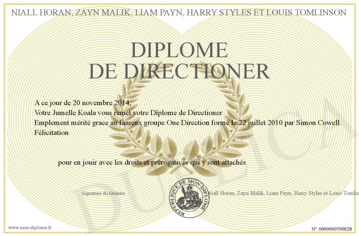 Envoyez par email votre Diplôme de Directioner personalisé